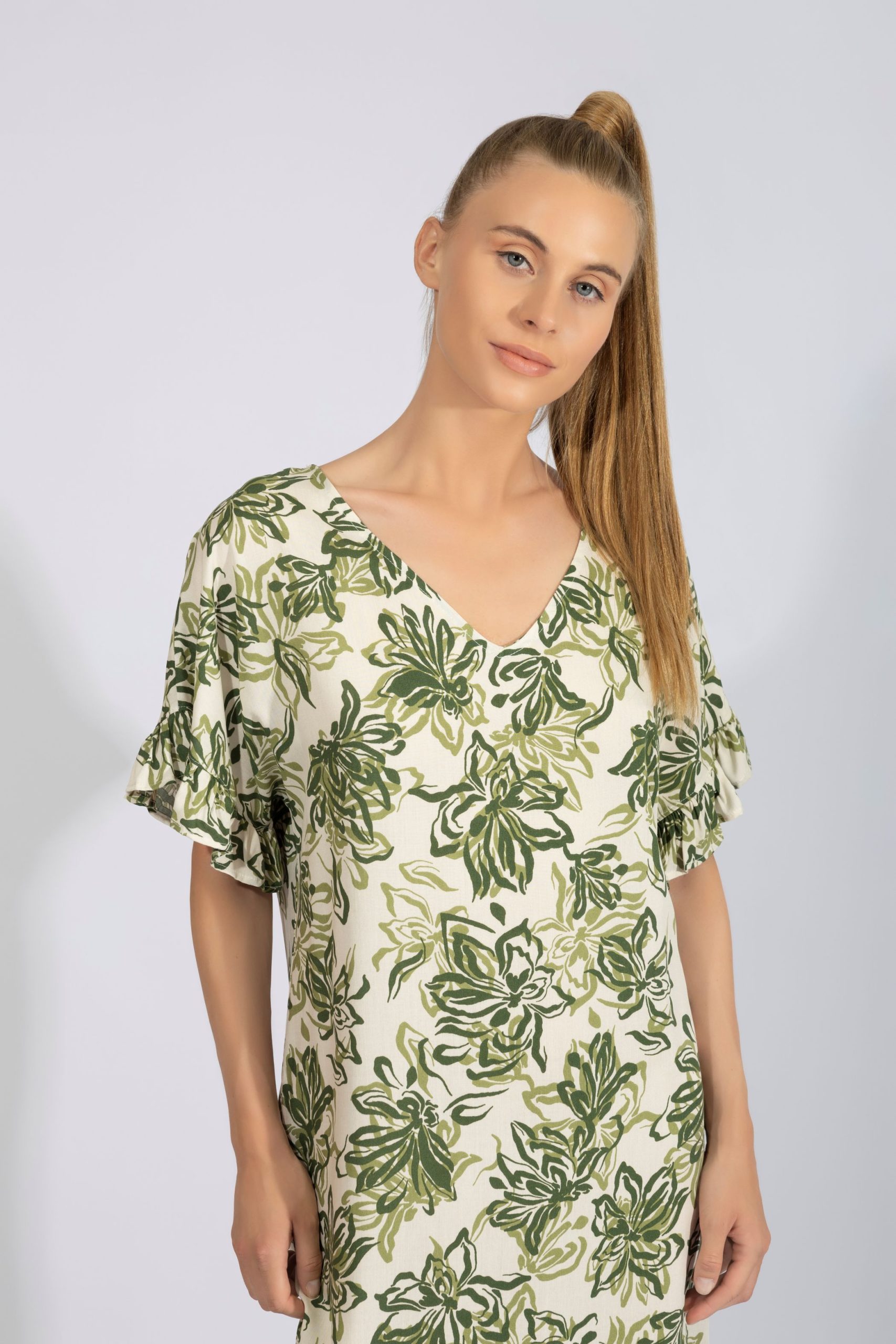 Harmony Olive Viscose Γυναικείο Φόρεμα με Κοντό Μανίκι