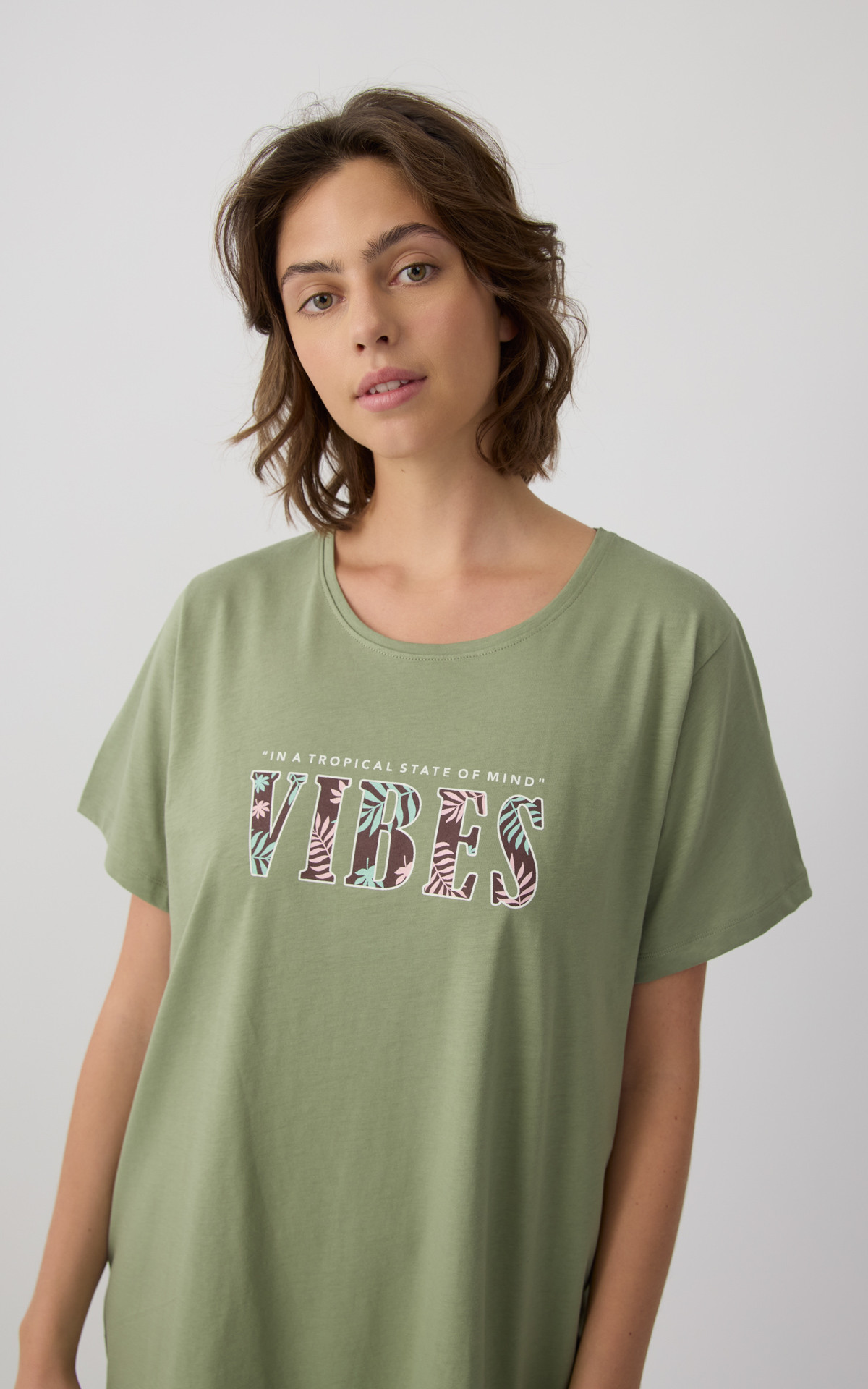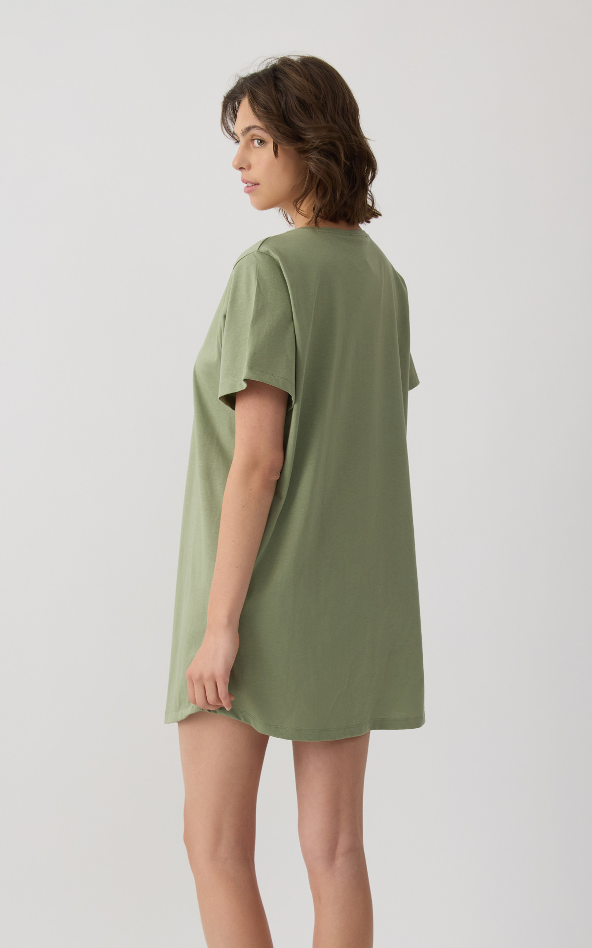 - Boyfriend T-shirt Dress με κοντό μανίκι και διακοσμητικό τύπωμα στο στήθος που προσθέτει μοντέρνα και θηλυκή πινελιά. Κατασκευασμένο από 100% βαμβακερό ύφασμα εξαιρετικής ποιότητας, προσφέρει απαλή αίσθηση και δροσερή άνεση καθ’ όλη τη διάρκεια της νύχτας.