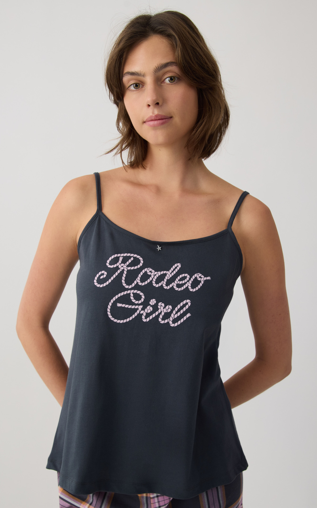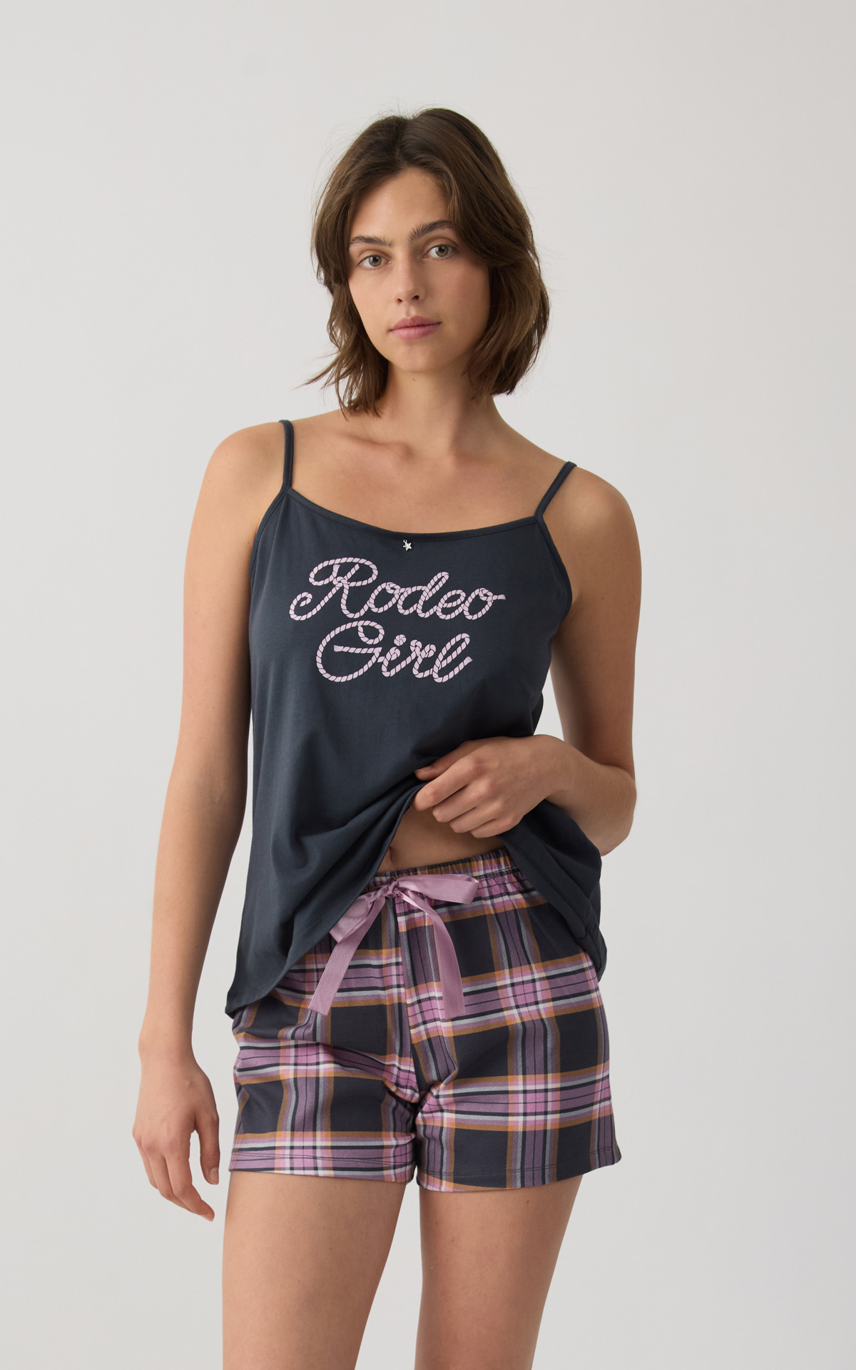 - Σετ πυτζάμας από 100% βαμβακερό ύφασμα εξαιρετικής ποιότητας που προσφέρει απαλή αίσθηση και δροσερή άνεση κατά τη διάρκεια της νύχτας. Το σετ αποτελείται από τοπ με λεπτές μπριτέλες και διακοσμητικό τύπωμα στο μπροστινό μέρος, καθώς και κοντό σορτς με λάστιχο στη μέση για άνετη και σταθερή εφαρμογή.